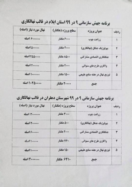 به گزارش روابط عمومی اداره کل منابع طبیعی و آبخیزداری استان ایلام بر اساس طرح ٩ در ٩٩، استانها فعالیتهای یکساله خود را تدوین و به ستاد سازمان جنگلها، مراتع و آبخیزداری کشور ارسال میکنند تا به عنوان سند اقدام یکساله منابعطبیعی وارد فاز عملیاتی شوند.