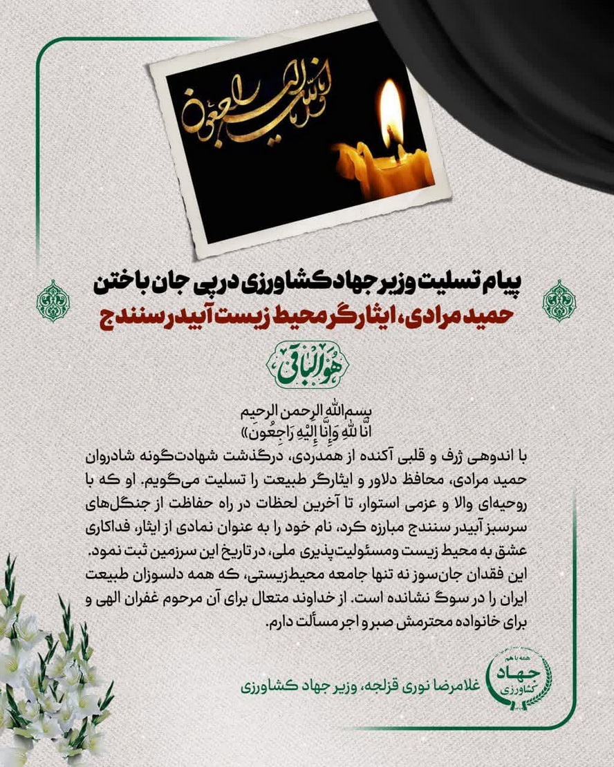 با اندوهی ژرف و قلبی آکنده از همدردی، درگذشت شهادتگونه شادروان حمید مرادی، محافظ دلاور و ایثارگر طبیعت را تسلیت میگویم. او که با روحیهای والا و عزمی استوار، تا آخرین لحظات در راه حفاظت از جنگلهای سرسبز آبیدر سنندج مبارزه کرد، نام خود را به عنوان نمادی از ایثار، فداکاری، عشق به محیط زیست و مسئولیتپذیری ملی، در تاریخ این سرزمین ثبت نمود.